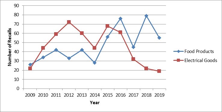 We have been tracking the number of food product recalls on the FSA website for some years now and the figures are pretty low and fairly steady (the figures for electrical product recalls, also shown, actually appear to be falling):